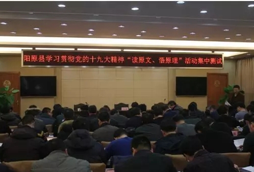 1月19日,阳原县委组织部在阳原地税五楼会议室组织了学习贯彻党的十九大精神“学原文、悟原理”活动集中测试,全县近130名党员科级党员领导干部参加了测试。